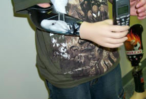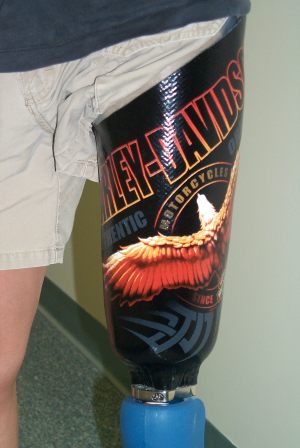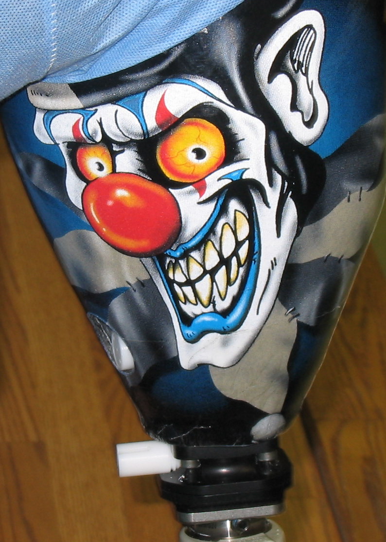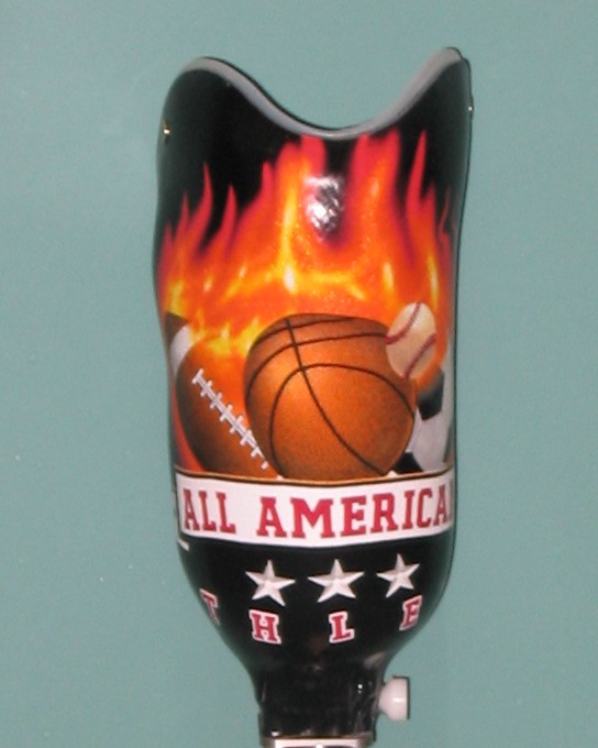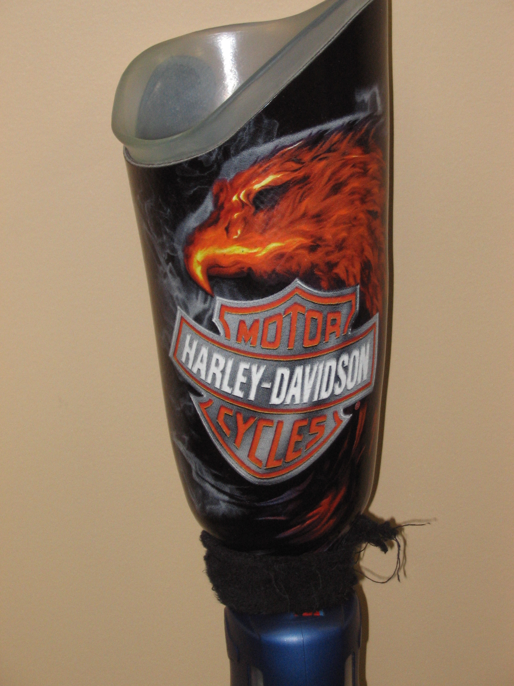 We can insert fabric designs into your socket laminations. These clients gave us T- shirts they liked to be incorporated into their prostheses.